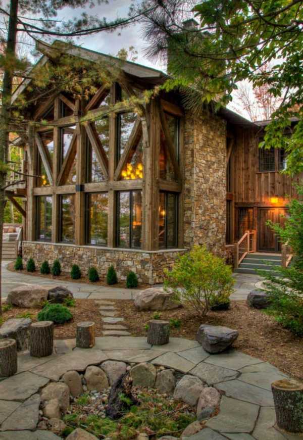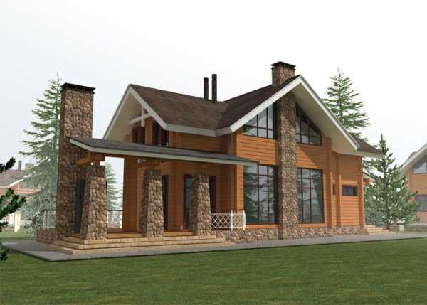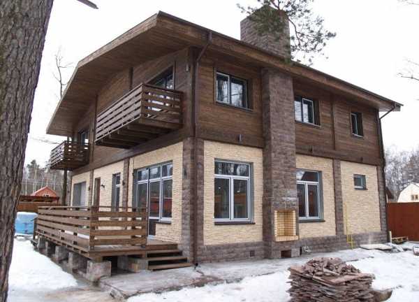 - Фасад. В одноэтажных домах из дерева выполняется фасад. Если предусмотрен второй этаж, тогда фасад первого делается из природного камня.