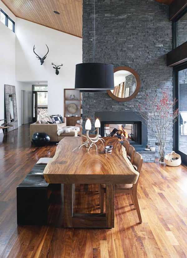Стиль шале, изначально мужской и грубый, давно адаптировался к сегодняшним реалиям и разделился на два направления. Одно наполнено сельским уютом, тишиной и спокойствием, другое — охотничьей романтикой. В первом преобладает глиняная посуда и картины в деревянных рамах, во втором – гобелены и охотничьи трофеи.