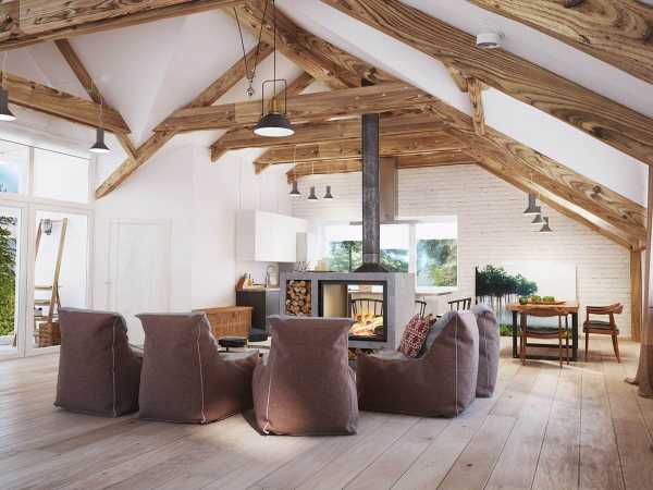 Жилые постройки в стиле «шале» в обязательном порядке оснащаются внутренними источниками отопления. Внутренняя планировка дома позволяет установить в гостиной камин или каминную печь, которая будет служить, как основным, так и вспомогательным источником отопления.