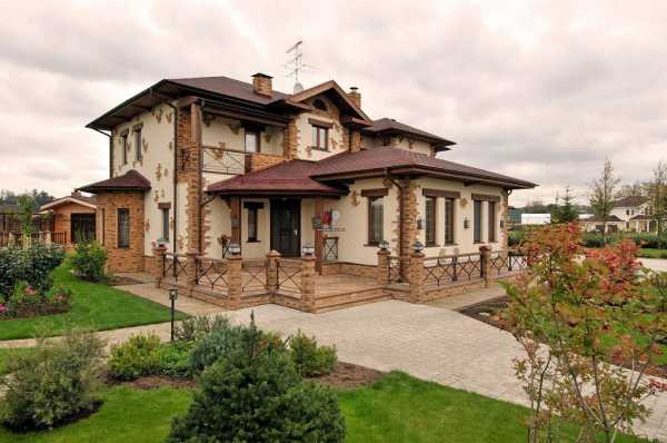 За края фундамента сильно выступает крыша, значения не имеет это одно или двух этажные дома с просторной мансардой. Таким строениям присущий мощный конек и каменный дымоход.