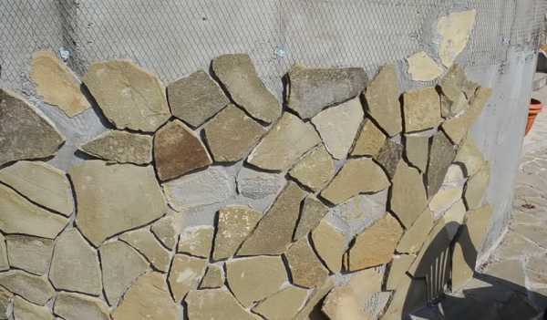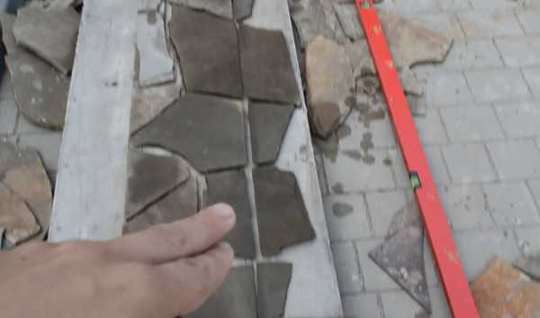 Шаг 5. Крепят остальные плашки, в точности повторяя раскладку. Завершив первый участок, проверяют стыки, обнаруженные пустоты заполняют раствором. Далее опять раскладывают камни на земле, заново замешивают раствор и облицовывают следующий участок.