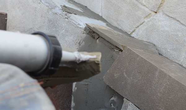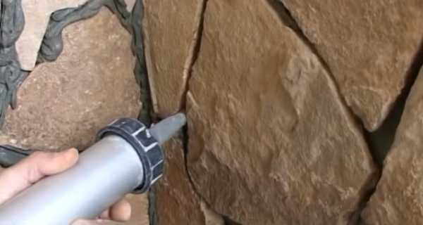Чтобы лучше соединить два камня на внешнем углу, наносим немного полиуретанового клея на торец камня