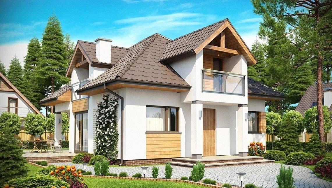 Лаконичный дом с большой гостиной на первом этаже и спальнями с санузлом на втором. Мансарда оборудована балконом. Просторные окна не мешают поступлению света в помещения. Этот вариант не слишком дорогой, но невероятно красивый и практичный.