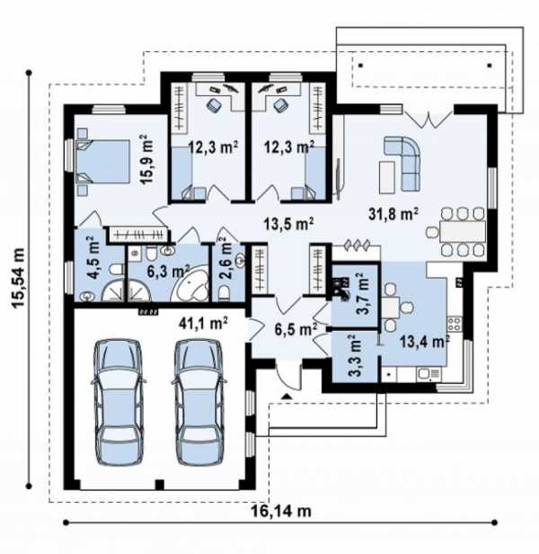Вернуться к оглавлениюПроекты одноэтажных домов с гаражом на 2 машины