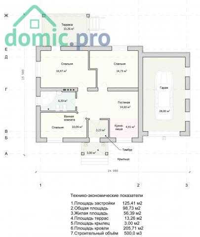 Общая площадь — 98,73 м², 3 спальни, гостиная, кухня — ниша, ванная, тамбур, терраса, гараж, одноэтажный с гаражом. Удобный компактный дом с комфортной планировкой для небольшой семьи. Он имеет небольшие размеры. Он не будет дорог в строительстве и последующем обслуживании. В доме предусмотрены 3 спальни. Он подойдёт небольшой семье с детьми. Все жилые комнаты имеют прямоугольную удобную форму, а также ниши под гардеробы. Горизонтальная несущая стена внутри дома делает его конструктивную схему простой и удобной. Гостиная совмещена с кухней-нишей. Это делает планировку свободнее. Из спальни есть выход на террасу. На входе имеется тамбур. Дом имеет четырёхскатную кровлю. К нему пристроен гараж. Он подойдёт для молодой семьи. Простота и удобство планировки делают этот проект интересным.