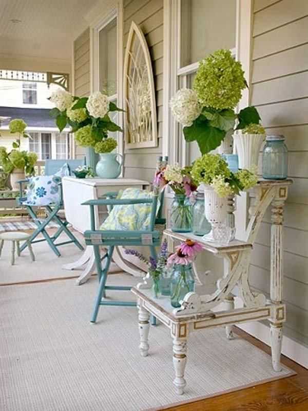 Около входных дверей и на веранде или терассе можно расставить цветы в горшках или ящиках, поставить кованые или деревянные скамейку с подушками и журнальный столик. Уличные кованые фонари и светильники будут смотреться очень уместно. На участке посадите цветники из неброских, простых цветов, можно поставить беседку, увитую растениями, с плетёной мебелью.
