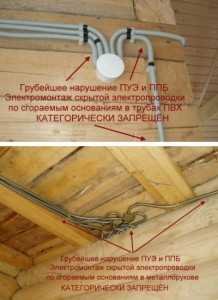 Почему так происходит? В целях экономии денег и времени, часто бывает монтируют провод по деревянным конструкциям, пряча между деревянных балок или за поверхность потолка, в деревянных пустотах и плинтусах.