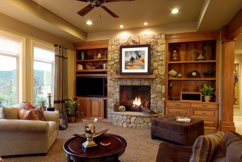 Также центральным элементом может быть и камин, возле которого уютно разместятся кресла, качалки или даже роскошные шкуры для отдыха.
