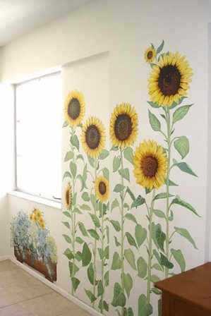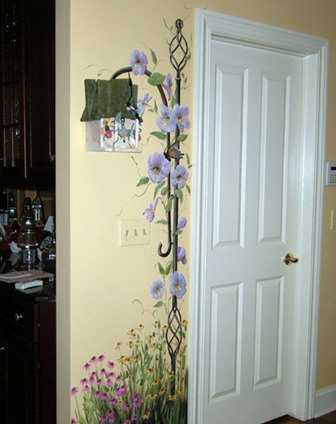 23.Буйство цветов. Покрыв все стены помещения подобным образом, можно вызвать психологический дискомфорт. Однако при правильной расстановке мебели и умелом сочетании цветов такая роспись на одной из стен будет смотреться интересно.