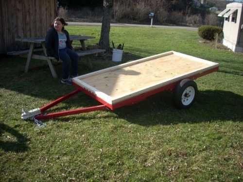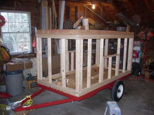 - На прицеп положить довольно толстую фанеру для дальнейшей эксплуатации в качестве пола. По бокам прицепа установить брусья и прикрепить их болтами.