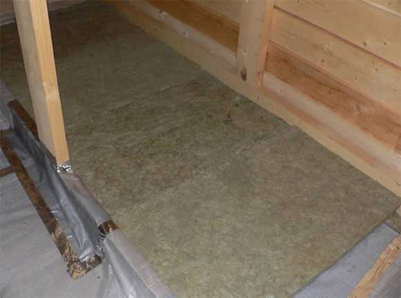 Пол нужно уберечь от излишней влаги. Для этого следует постелить на древесный пол гидроизоляционную пленку с возможностью пропуска пара с края жилого помещения или же замазать пол глиной, перемешать опилки и цемент (10:1, где 10 частей опилок, 1 часть цемента) и после этого добавить 1,5 части воды. Получившуюся смесь засыпать на пол чердака или же между балками перекрытий чернового пола. Эту работу лучше реализовывать весной, чтобы летом цемент с опилками хорошенько просох. После просушки опилки не проминаются, а немного хрустят под ногами.