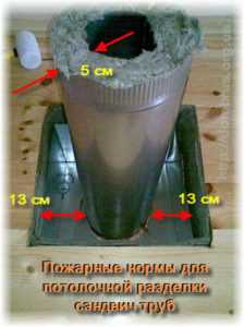 Что делать, если через перекрытие на основе деревянных балок проходит вентиляционный трубопровод или дымоход? Если на пути вертикально ориентированной магистрали расположена балка, она разрезается, а нагрузка переносится поперечными элементами на соседние балки. При этом расстояние от наружной поверхности до обвязки из перемычек должно составлять не менее 100 мм.