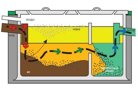 В камеру с биофильтром искусственно заселяют колонии анаэробных бактерий. Организмы перерабатывают большинство органических соединений. Среда обитания микроорганизмов – корка на поверхности. Формируется воздухонепроницаемая пленка из жира, попадающего в слив.