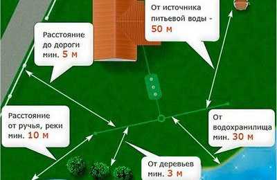 Согласно СНиП 2.1.5.980-00 расстояние до открытых водоемов с стоячей и проточной водой не должно быть менее 15 метров. Откачная труба (нижний ее конец) в первой камере должна располагаться на расстоянии 200-300 мм от дна камеры.