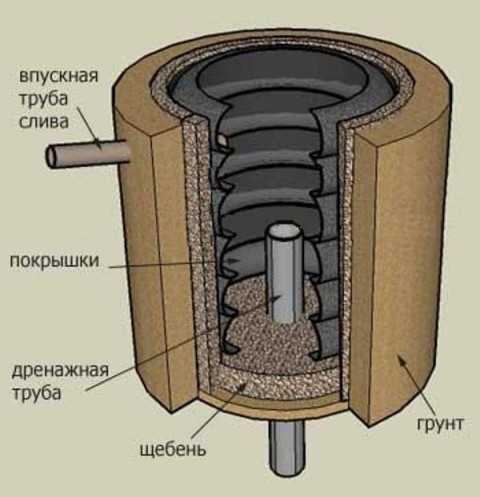 Конструкция без сплошного дна, по отзывам владельцев такой автономной канализации, дает возможность снизить частоту откачки. Приемные резервуары устанавливают на донный фильтр. На дне устраивают двойную засыпку щебнем и песком. Засыпка выполняет функцию механического фильтра, очищая проходящую через насыпные слои воду и задерживая плотную массу на поверхности.