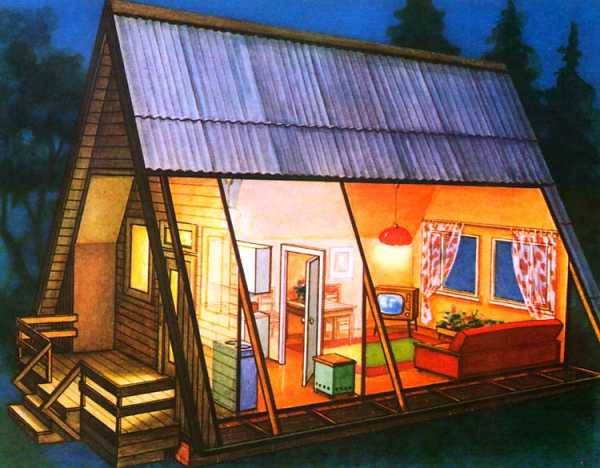 Строение в виде треугольника имеет популярность и в наше время, но для постоянного места проживания его практически не используют. По большей части эти симпатичные домики возводят на дачах, на берегу рек и в лесу для отдыха рыбаков и охотников.
