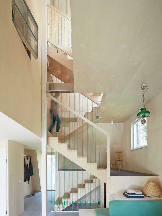 Нередко в домах такой формы сооружают надстройку. Здание получает не слишком высоким, поэтому под условный второй этаж отводят только половину. Под крышу ставят кровать, а нижний уровень занимают другой полезной обстановкой, в том числе санузлом. Для лестниц используют один из экономичных вариантов: