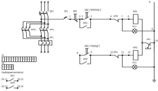 Нормально замкнутые контакты реле К1.2 и К2.2 размыкаются в противоположные стороны при срабатывании соответствующего реле, тем самым предотвращается одновременное срабатывание обоих реле, что может привести к короткому замыканию.