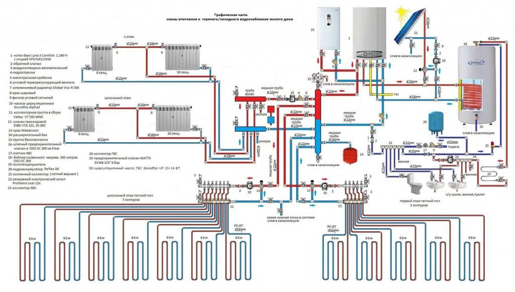 В этой статье описана система отопления двухэтажного дома, площадь каждого этажа 80 м2. В качестве источника тепла используется одноконтурный газовый котел мощностью 20..24 кВт. Приготовление горячей воды производится в бойлере косвенного нагрева емкостью 120~180 литров.