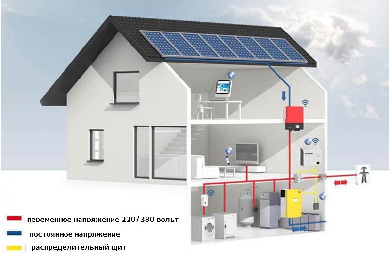 - инвертор – преобразователь постоянного тока, поступающего в систему от блока фотоэлектрических солнечных батарей, в переменный, который подается непосредственно в энергосистему объекта.