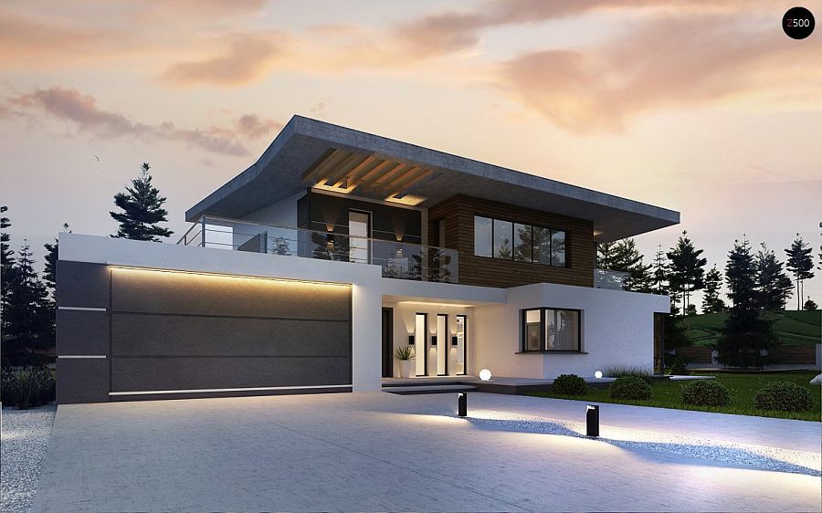 Проект дома Zx5 — Практичный двухэтажный дом в современном стиле с обширной террасой над гаражом.