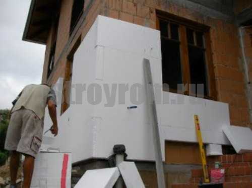 Кладутся плиты ППС на ровную подготовленную поверхность. Стяжку делать не нужно, но убрать все выступающие элементы придется. Крепится пенопласт на специальный клей, а для улучшения адгезии стены предварительно обрабатываются грунтовкой.