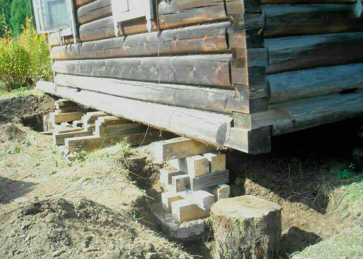 - Перенос сруба на новое основание (строение медленно и равномерно опускают, затем удаляют домкраты).