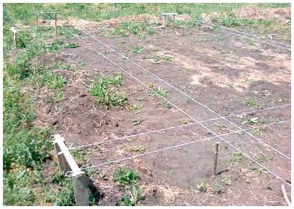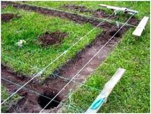 Перед началом работ производится разметка — по углам будущего здания вбиваются колышки и натягивается шнур. На этом этапе обязательно нужно провести проверку диагоналей. Они должны быть одинаковыми. Далее на всей площади удаляется мусор и растительный слой и намечаются места установки столбов.