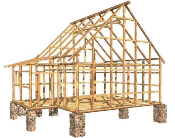 Деревянный столбчатый фундаментНапример, при строительстве деревянного дома под несущие деревянные балки или брусья устраиваются отдельные столбы, которые и будут воспринимать нагрузку от их веса. Если строительство каркасного дома производиться в местности, где основным строительным материалом будет дерево, то возможно устройство столбчатого фундамента из древесины. Обрезки диаметром от 15 до 30 см комлевой части бревен из сосны или дуба подойдут для фундамента в виде «стульев», устанавливаемых в вертикальном положении в открытый котлован.
