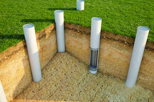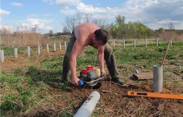 Для фундамента из монолитного бетона или асбестовых труб удобно использовать мотобур. Ямы могут быть как прямыми, так и с расширением в нижней части. Более широкая подошва увеличит несущую способность основания и повысит его устойчивость к пучению. Теперь необходимо сделать гидроизоляцию фундамента. Для этого в каждую яму следует опустить трубу из рубероида или полиэтилена. Верхние края гидроизоляции необходимо прижать к почве камнями или присыпать землёй.