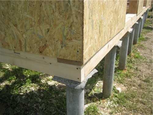 В любом случае сделайте мощную, хорошо скрепленную обвязку, а в случае монтажа домика на брусах или железобетонных ригелях, закрепите их длинными анкерами, вбитыми в землю под углом. И обязательно помните об антисептической обработке.