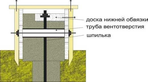 Доска нижней обвязки обрабатывается праймером, оборачивается слоем рубероида и выставляется четко по уровню. Бетон заливается по ее верхнему краю. При этом сами щиты опалубки не нужно скрупулезно выравнивать по высоте. Выставив опалубку, вам не придется возиться со шнурами в процессе заливки бетона, чтобы проконтролировать уровень. Труба вентотверстия служит не только дистанцией между щитами опалубки, но и придает жесткость всей конструкции.