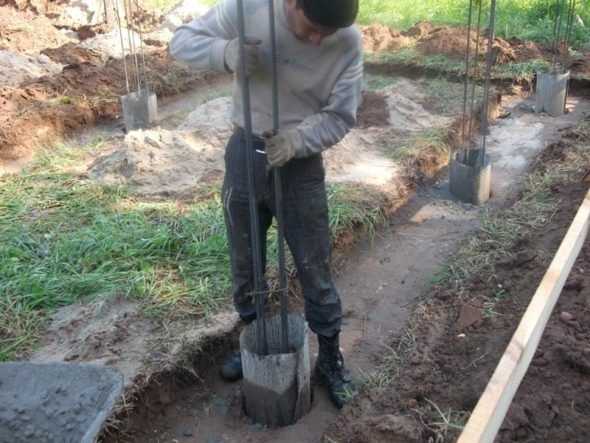 В готовые скважины устанавливается опалубка их асбестовых или металлических труб (несъёмная) или досок (съёмная). Затем в каждый котлован вставляется арматура диаметром 10–14 мм (как минимум по 4 шт.). Горизонтальные перемычки изготавливают из более тонких прутьев по 6 мм.