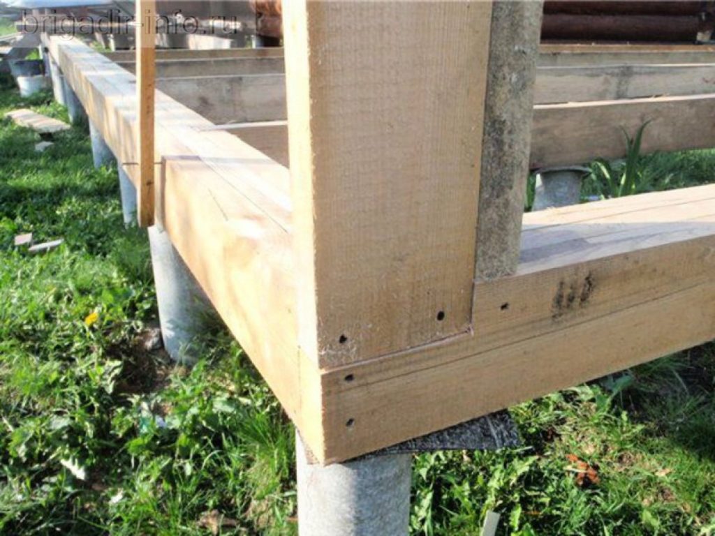 Под внутреннюю несущую конструкцию монтируем еще 2-3 стойки внутри по периметру. С помощью уровня следим за тем, чтобы все опоры находились на одном уровне по высоте. Остается только уложить поверх каждой опоры лист рубероида и собрать нижнюю обвязку.