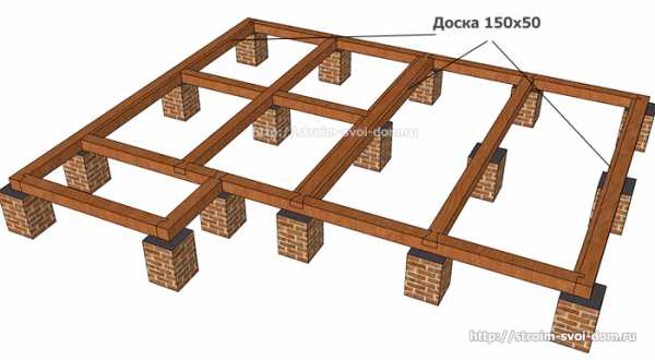 - Обратите внимание на доски, прибитые с внутренней стороны к обвязочному брусу. Размер этой доски 150 х 50 мм. Они служит в качестве выступа на которой будут лежать в дальнейшем доски пола.