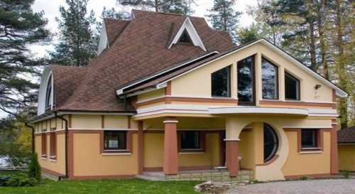 Иногда для придания индивидуальности проектировщики используют не совсем обычные формы крыш частных домов. Такие крыши обычно выделяются плавными формами и закругленными краями. Но такая красота достигается за счет усложнения стропильной конструкции, что ведет к увеличению её веса.
