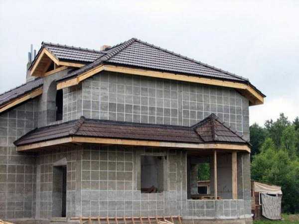 После выгона стен закрывают потолок и устанавливают каркас крыши, делают обрешетку и закрепляют кровельный материал.