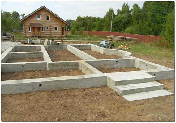 Если предполагается использование таких материалов, как кирпич, брус, пеноблоки, возведение, также следует начинать с этого вида фундамента. Для более легких типов строений, возможно использование дешевого столбчатого вида фундамента. Представляет он собой столбики, расположенные по цепи на расстоянии 1-2 м один от другого.