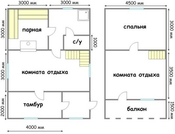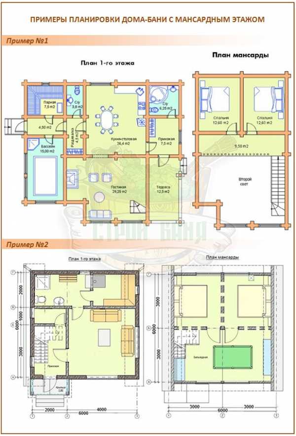 Схема двух этажей бани с мансардой