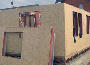 В каркасно-панельных домах к основанию крепят панели из OSB или сип панели. В первом случае пространство внутри стен утепляют. СИП панели представляют собой два листа, между которыми утеплитель уже вклеен в заводских условиях, а на торцах выполнены соединительные замки. Листы могут быть изготовлены из OSB, гипсокартона, профнастила и других материалов.