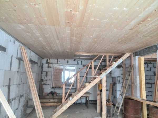 На данный момент, изнутри сделал утепление потолка. Сразу натянул по потолку пароизоляционную мембрану, со стороны первого этажа — подшил потолок рейкой «Штиль», со стороны второго — уложил рулонный утеплитель «Изовер» толщиной 20 см. Поверх него в дальнейшем уложу бумагу пергамин, а уж сверху — половую доску второго этажа. С учетом всех работ, высота потолка на первом этаже составит 2.7 м. Мансардный этаж будет пониже — 2.45м. Этажи между собой связаны лестницей, которую тоже делал сам. Использовал два бруса 150х50 мм для «тетивы» и подпорки посередине, для ступенек — доску 40 мм толщиной.