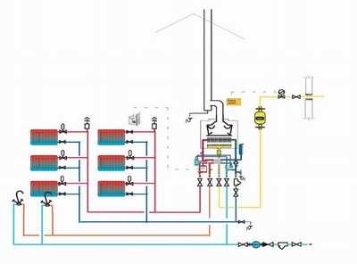 Так выглядит стандартная схема системы отопления, в которой нагрев теплоносителя обеспечивает газовый двухконтурный котел, который может быть как дымоходным, так и турбированным.