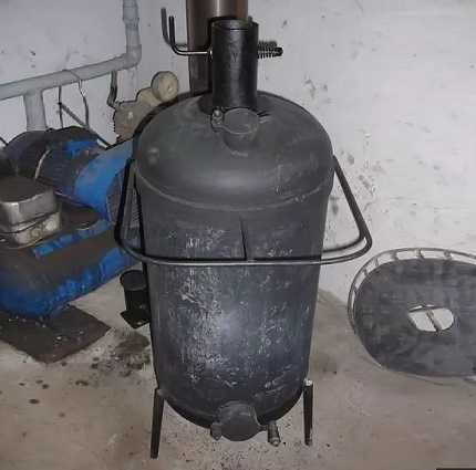 Самодельная печка-буржуйка с питанием жидким топливом, а именно – отработанным машинным маслом. Конструкция сомнительная в плане безопасности и не совсем удобная в применении. Но на основе таких сооружений умельцы делают тепловые пушки