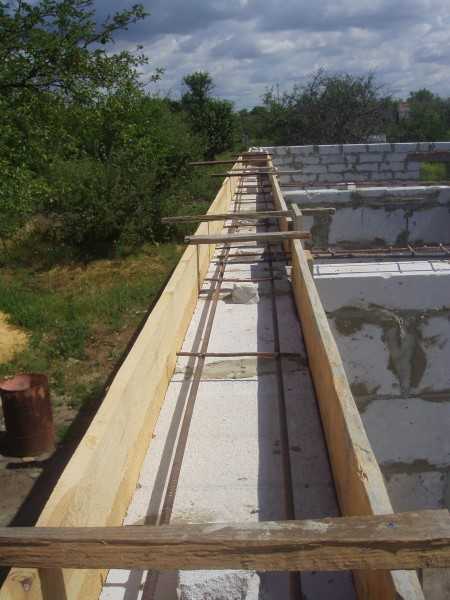 - Когда дойдете до последнего кирпичного ряда, размешайте бетонный армированный пояс. Установите сетку из металла и залейте ее бетоном. Пояс не даст образовываться трещинам в стенах.