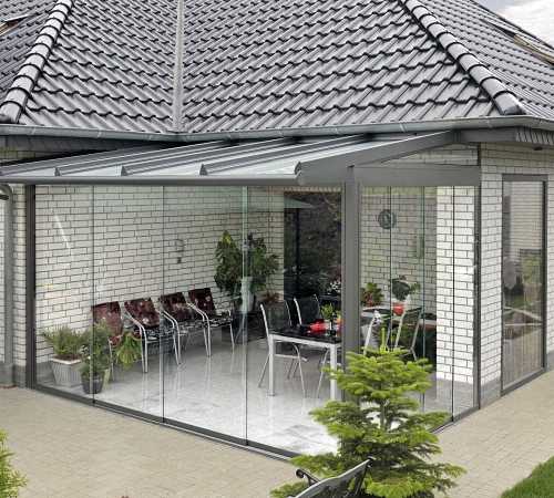 - Закрытая терраса. Окружается стенами с большими окнами, которые служат для циркуляции света. Требует возведение фундамента. Может использоваться как полноценная жилая комната зимой и летом, если предварительно утеплить.