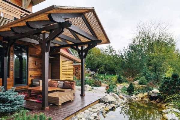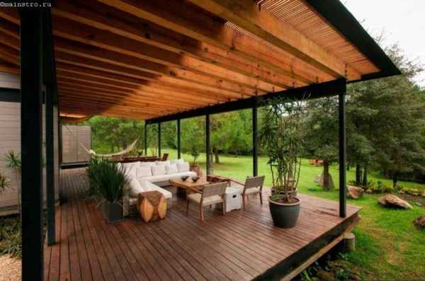 Терраса из дерева или камня представляет собой пристройку к основному зданию. Для защиты конструкции используется навес или крыша.