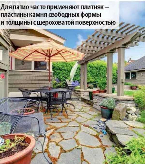 При выборе мощения учитывайте нагрузку на поверхность. От этого зависит конструкция пола, его ширина и выбор материала. Проекты домов с гаражом и террасой должны предусматривать мощение, выполненное на двойном слое гравия разного размера. Если же по патио не будут ездить автомобили, то основание можно не усиливать.