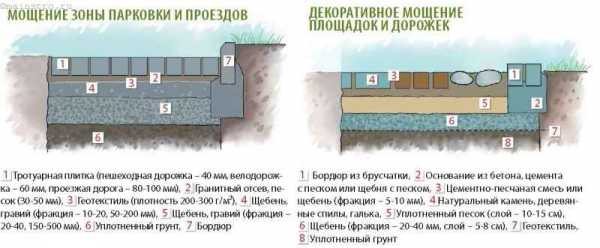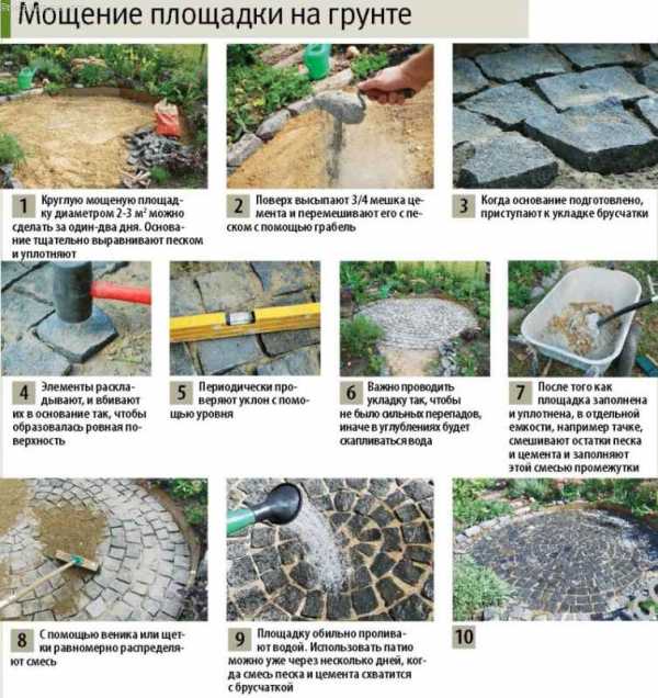 Лучший вариант мощения площадки – это организация корыта в грунте глубиной 200 мм, дно которого трамбуется и выравнивается. На дне делается дренаж из смеси песка и гравия. Это позволит быстро удалять воду с поверхности и не даст разрастаться сорнякам. Дополнительную защиту от сорняков можно получить, проложив в основании площадки слой геотекстиля. Чтобы площадка не расползалась и не загрязнялась почвой, по краям монтируются бортовые камни. Чтобы мощение не мешало движению газонокосилки, его высота не должна превышать 20-30 мм.