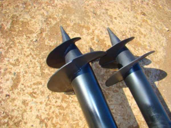 Винтовой свайный фундаментПредставляют собой отрезок толстостенной трубы Ø 100–150 мм, к которой приварена лопасть. Свая вкручивается в почву вручную или при помощи бура на глубину не менее 1,5 м, высота над уровнем земли делается 0,3–0,4 м. По периметру установленных опор производят обвязку фундамента швеллером или уголком.