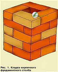 Кирпичный столбик для столбчатого фундаментаДля устройства столбиков используют кирпич, его выкладывают в форме квадрата с перевязкой через каждые 3–4 ряда. Внутри кладки оставляется колодец, который или бутят песчано-гравийной смесью с цементным молочком, или армируют проволокой Ø 5–6 мм и заливают бетоном.